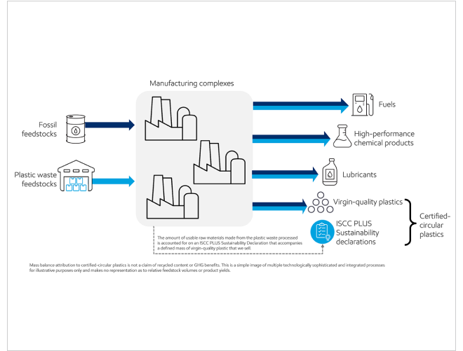 简单的说,是一种适用于我们这类复杂价值链的核算方法——在多产品输出系统中,一种原材料的输入(比如塑料废弃物)与其他原材料输入相混合。这种方法帮助我们的客户将其购买的认证循环塑料*与通过化学回收将塑料废弃物转化为可用原料的相应数量所匹配。我们向客户提供的国际可持续发展和碳认证(ISCC)PLUS 的“可持续发展宣言”,并不意味着我们的认证循环塑料*含有任何“回收材料”或温室气体排放优势。相反,该证书代表一种保证,即我们遵循了由第三方在原料基础上认证的稳健的质量平衡归属系统。